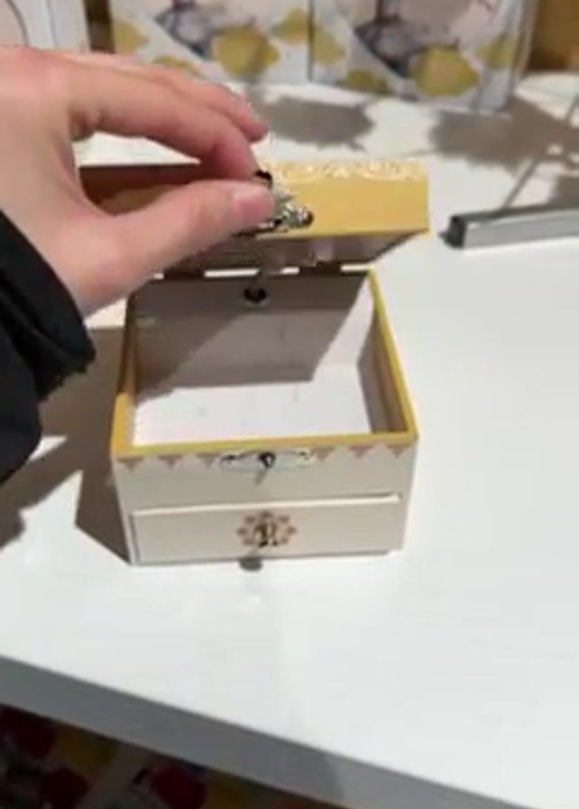 hand opening a cream and gold ballerina music box with a small drawer