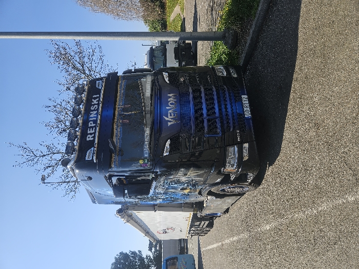 - "A black Scania S500 semi-truck, registered with Polish license plate GO-RT12, is parked on an asphalt surface with a white dashed line marking in the city of Ger, France" by FM-bCw3N2, licensed under CC BY 4.0