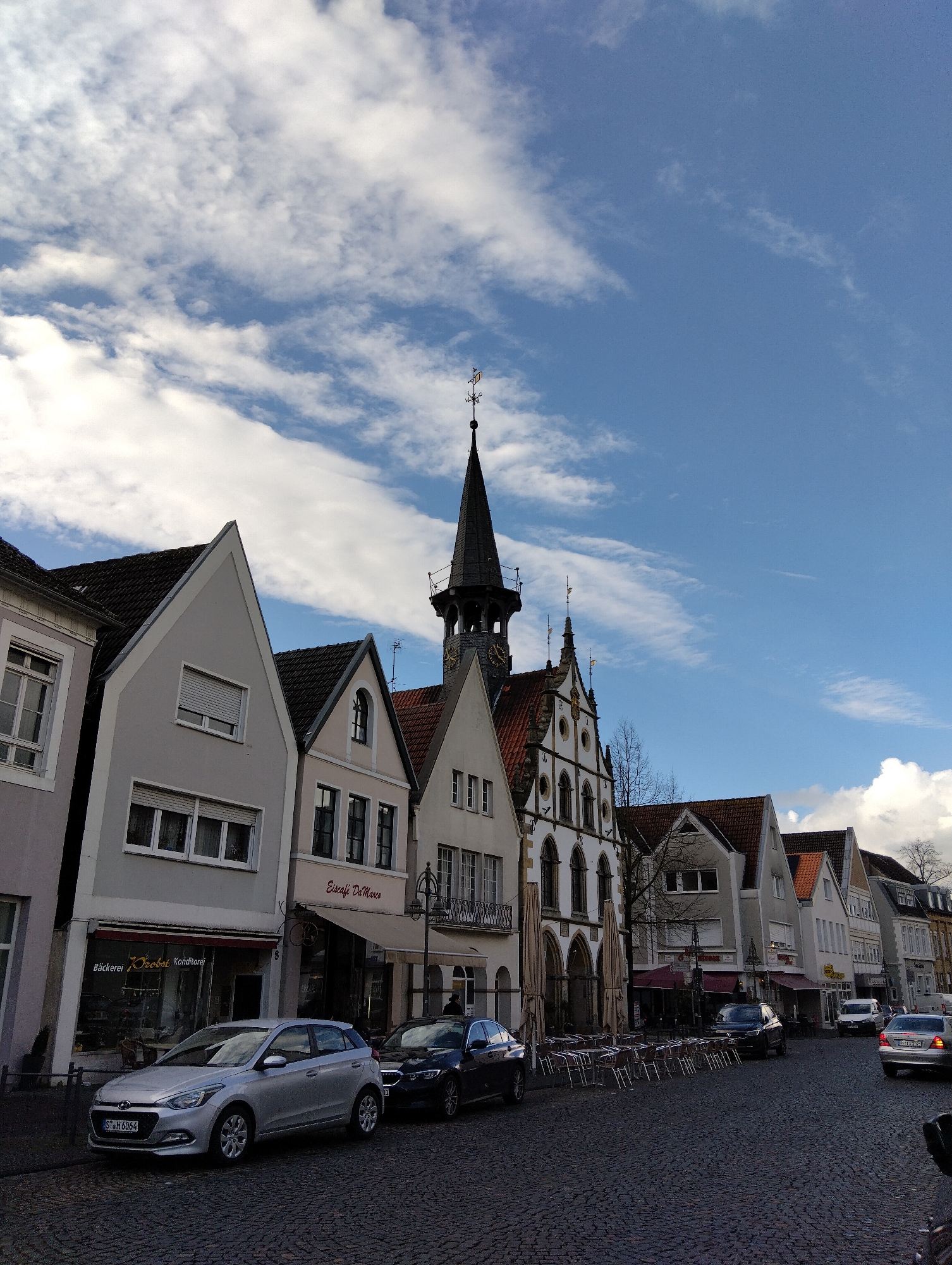 The image depicts a daytime street scene in Burgsteinfurt, Germany. A long row of multi-story buildings with varied facades lines a cobblestone street. Dominating the upper right-center is a historic building featuring a tall, dark, pointed spire with a weathervane and a visible clock face. Adjacent to it on the left is a prominent white building with ornate arched windows, decorative elements, and a red-tiled gabled roof. Other buildings in the row have gabled roofs and varying exterior colors, from light grey to white and beige. On the left side of the street, a silver Hyundai i20 hatchback (German license plate ST H 6064) is parked on the cobblestones in front of a building housing "Bäckerei Drobisch Konditorei" and "Eiscafé Di Marco." Another dark sedan is parked directly behind the Hyundai. Further down the street on the right, several other vehicles are present, including a dark sedan and a silver sedan (German license plate MS TS 703), as well as a white van. In the mid-ground, numerous empty outdoor tables and chairs are arranged on the cobblestones in front of the businesses, some with large, closed umbrellas. No individuals are clearly visible. The sky above is blue with scattered white stratocumulus clouds. The lighting indicates daylight conditions.