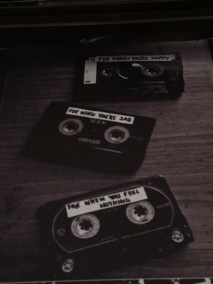 The scene in Voa Yeav, Cambodia, depicts three black audio cassette tapes arranged diagonally on a dark, horizontally-grained surface. The image is rendered in grayscale. The uppermost cassette bears a white label inscribed with "FOR WHEN YOU'RE HAPPY". The middle cassette, identified by "maxell XL II 90", has a white label reading "FOR WHEN YOU'RE SAD". The lowermost cassette displays a white label marked "FOR WHEN YOU FEEL NOTHING". All cassettes feature two visible circular tape reels. The lighting is dim, casting soft shadows. No people, actions, or specific interactions are visible beyond the static arrangement of the objects.