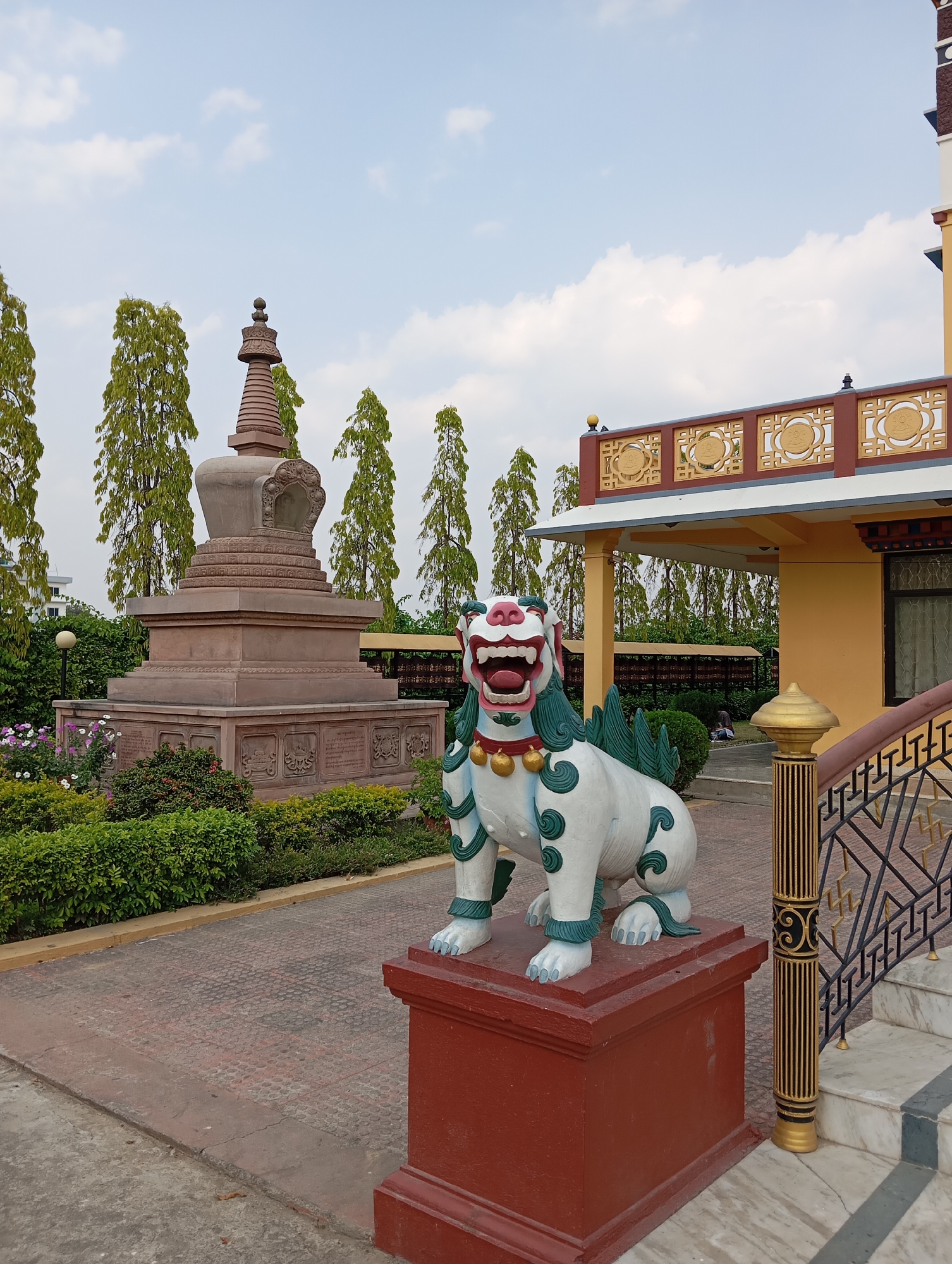 scene in Oshojetban, Nepal. A painted lion statue sits on a red pedestal in front of a yellow building with a brown-and-white ornate railing. To the left of the lion, a tiered stupa stands amidst green shrubs and flowers. In the background, tall, slender trees line the scene under a slightly cloudy sky. The ground is covered with patterned brickwork. Stairs with a decorative black and gold railing lead up to the building.