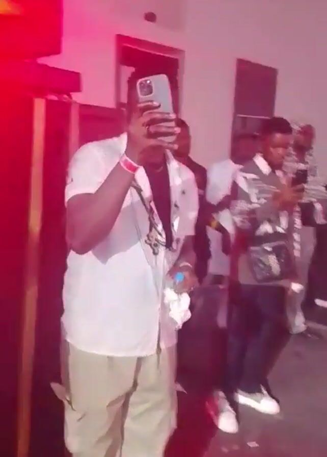 group of people in what appears to be a party or club setting. There are several people in the foreground, including a man holding up his phone to record, smiling, with a water bottle in his hand. Others are standing around, some using their phones as well. The lighting is colored, mainly red and white. In the background, a stage is visible with what looks like lighting equipment. People are milling around and the scene seems active.