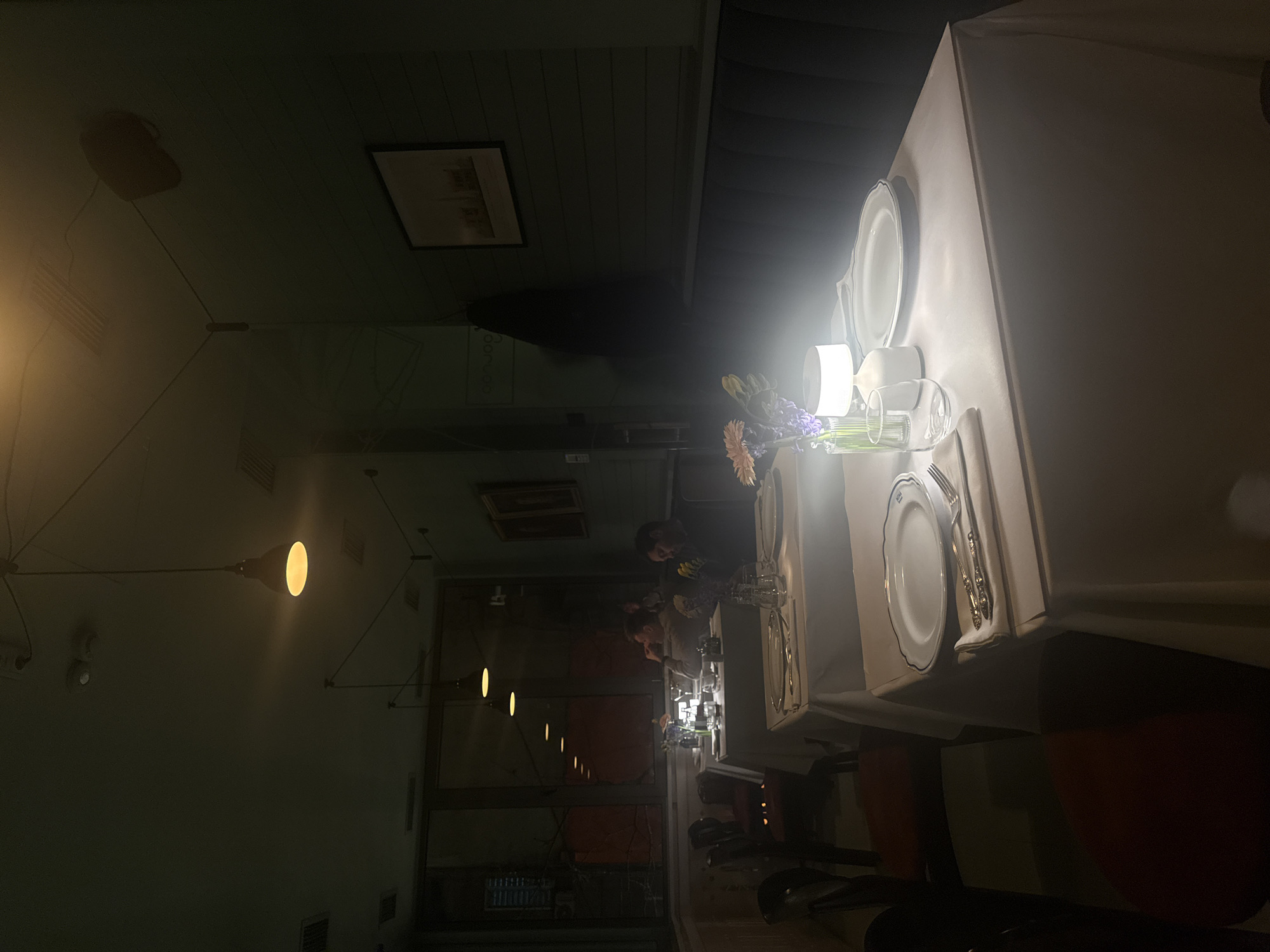 This image depicts the interior of a dimly lit restaurant or dining establishment located in Yerevan, Armenia. The scene is characterized by warm, ambient lighting from ceiling fixtures and bright, localized illumination from small, cylindrical table lamps. In the immediate foreground, an unoccupied table draped with a white tablecloth is prominently featured. It is set with a white plate (featuring a blue rim), silverware resting on a white napkin, a clear drinking glass, and a small glass vase containing purple and orange flowers. A radiant white table lamp sits beside the vase, casting a strong glow on the table setting. To the left, dark wooden chairs with reddish-brown upholstered seats are visible. Moving into the midground, several additional tables are visible, also covered with white tablecloths. At one table on the left, two men are seated. One man, with dark hair and a beard, wears a dark garment and is looking downwards, possibly at a device. The other man, partially obscured, is engaged in a pose suggestive of conversation. Adjacent to these tables, a large window reflects the interior of the establishment, and beyond it, a dark exterior is discernable. The background reveals a muted blue-green or dark teal wall with horizontal paneling on the right side. Two framed pictures hang on this wall, with another visible on a far left wall. A dark, upholstered booth-style bench runs along the right wall. The ceiling is dark, featuring exposed wires, several round pendant lights emitting a warm yellow glow, and rectangular air vents. The overall atmosphere is intimate and somewhat subdued.