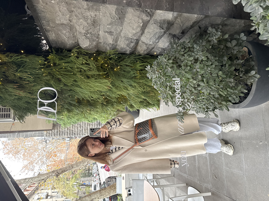 A young adult female is depicted standing outdoors, taking a selfie using a silver smartphone, reflected in a large glass surface. She has light brown hair and a faint smile. She is wearing a long, cream-colored double-breasted coat over a plaid shirt and light grey sweatpants, paired with chunky white sneakers. A dark brown and tan patterned cross-body bag with a light brown strap is slung over her left shoulder. To the right of the woman, beyond the reflective surface, is a tall, dense vertical display of green foliage, likely cypress or cedar, adorned with small, warm-toned string lights. A white neon sign spelling "DEO" is affixed to this foliage. Adjacent to the foliage on the right is a dark gray stone wall constructed from rough-hewn blocks. In the immediate foreground, a potted plant with dark green leaves sits in a black cylindrical pot. Reflected in the glass surface behind the woman, to her left, is an urban street scene featuring parked vehicles, distant buildings, and deciduous trees, some bare and some displaying autumn foliage. A person in a red garment is visible in the background street. Two light-colored outdoor cafe tables are also reflected to the woman's left. The words "you are special" are superimposed in white script across the lower center of the image. This scene is located outside Cafe DeO in Tbilisi, Georgia, specifically identified by the "DEO" signage and consistent with the city's urban architecture and streetscapes.