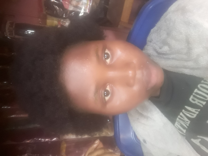 The image depicts an individual with dark skin and voluminous, dark, natural hair, facing directly into the camera