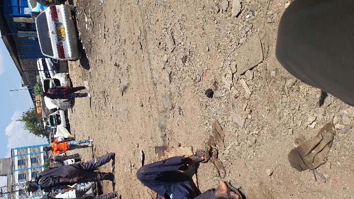 The image depicts an outdoor informal auto repair yard or junkyard in Kisumu, Kenya, under clear, sunny conditions. The ground is unpaved, consisting of dirt, gravel, and scattered debris. In the background, a multi-story building with light blue and white facade details is visible on the left. To its right, a line of partially dismantled or damaged vehicles, primarily white sedans, are parked. One white sedan on the right displays a Kenyan license plate: KBQ 281H. Further right, industrial structures, including blue shipping containers, are present. Several individuals are active in the midground. A man wearing an orange t-shirt and blue jeans walks from left to right. Another man in a dark patterned shirt and dark trousers walks from right to left. On the far left, a man in dark blue overalls and a cap walks towards the right. Other figures are partially visible behind him. In the foreground, the lower half of two individuals are visible. On the lower left, a person is seated on the ground, wearing dark blue trousers and dark flip-flops. Small metal fragments and debris lie on the ground near their feet. On the lower right, the knee and upper leg of another person, wearing light brown or grey trousers, are visible, suggesting the photograph was taken from a low, possibly seated, vantage point. The ground in the immediate foreground is littered with small rocks, dirt, and a rusted, U-shaped metal object.