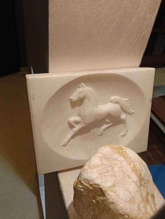 The image presents a still life of a light-colored stone relief sculpture and a natural stone, observed in an indoor setting in Sofia, Bulgaria. The primary subject is a rectangular, off-white to light-beige stone slab positioned vertically. This slab features a central, shallow, oval-shaped depression containing a relief sculpture of a horse depicted in profile, galloping or rearing towards the left. The horse possesses a stylized mane and tail. The stone surface exhibits a fine, granular texture. Partially obscuring the lower right corner of the relief slab and resting on a similar light-colored, textured surface is an irregularly shaped natural stone. This foreground stone is predominantly off-white with pronounced streaks and veins of light brown or ochre, indicating natural mineral variations. Both objects are positioned against a background of textured, light-colored, block-like architectural elements, suggesting a display or exhibition context. The ambient lighting illuminates the objects, creating subtle shadows that enhance the depth of the relief and the contours of the natural stone. The distant background is indistinct, showing darker, out-of-focus areas consistent with an interior room. No human figures or active elements are present in the scene.