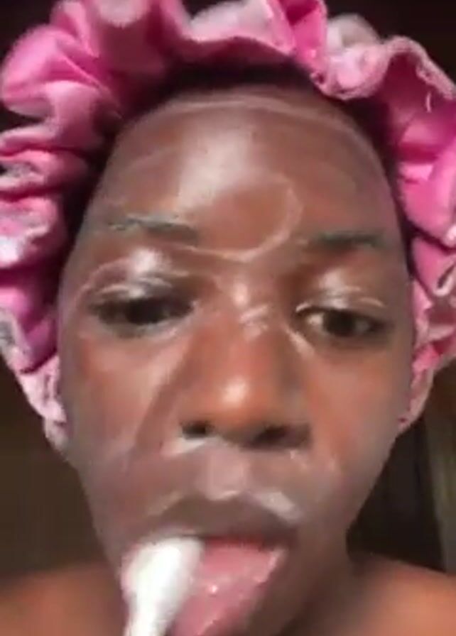 A close-up shot features a person with dark skin wearing a pink and white satin hair bonnet. Their face is covered with a white, soapy substance. They are brushing their teeth with a yellow and white toothbrush. The background appears to be a dark, indistinct wall. The person's eyes are focused on the camera, and their mouth is open during the brushing action.