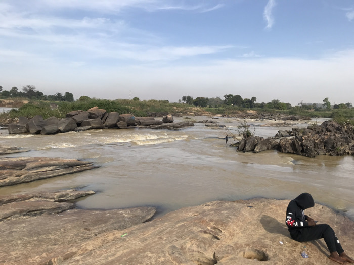 A river scene features rocky outcrops and turbulent, muddy water. Large stones are scattered across the riverbed, creating small rapids. A person sits on a large rock formation in the foreground, wearing a black hooded sweatshirt and pants. In the midground, another person stands in the water. Trees and vegetation line the riverbank in the distance under a bright, cloudy sky.