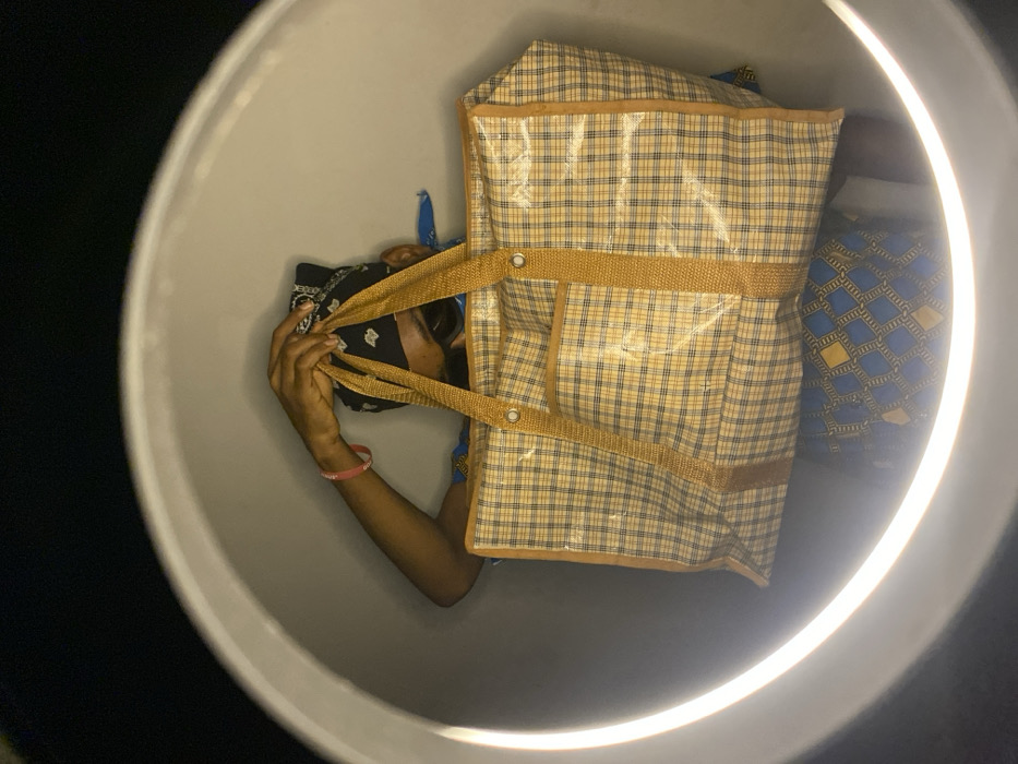A person with long nails and a black bandana is holding the handle of a large, plaid storage bag