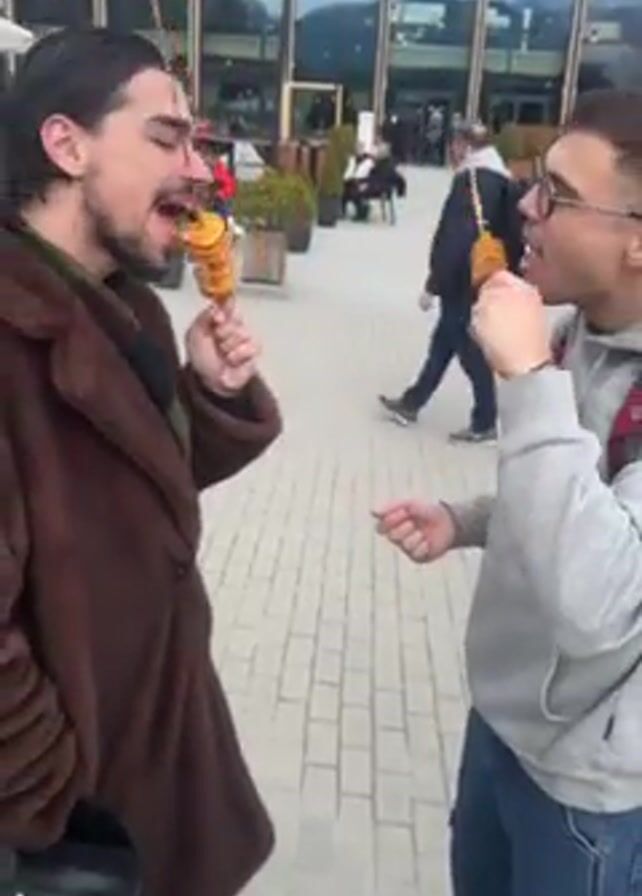 Two men, each holding a spiral cut potato on a stick, stand on a brick paved plaza in front of a building with large glass windows. The man on the left wears a brown coat and a scarf. The man on the right wears a gray hoodie, jeans, and glasses, and has a backpack slung over his shoulder. They clink their potato snacks together and then take bites. They both look at the camera and dance slightly. The background includes outdoor seating, plants in pots, and other people walking by. Mountains are visible in the distance through the building's windows.