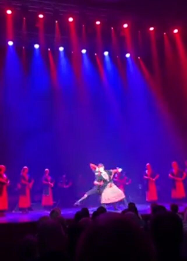 stage performance in front of a seated audience. A male and female dancer in traditional attire are performing a choreographed dance under bright red and blue stage lights. The male dancer wears a black outfit, while the female dancer is in a red dress. Behind them, a group of musicians in similar traditional clothing stand in a line, playing instruments. The stage is lit with a mix of red and blue lights, creating a dramatic atmosphere. The audience is visible in the foreground, mostly just the backs of their heads.
