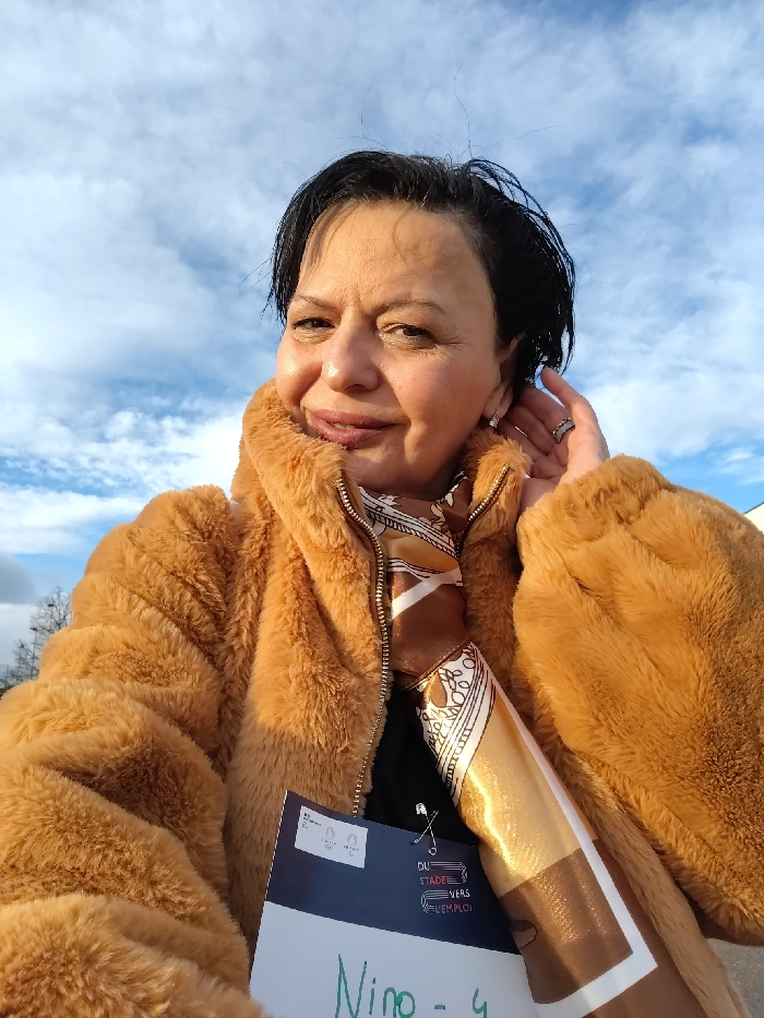 The image features an adult female outdoors in Geispolsheim, France, captured from the chest up under a bright, partially cloudy blue sky. She has short, dark hair, a light complexion, and is smiling faintly towards the camera. She is wearing a light brown or tan faux fur jacket, fastened with a zipper, over a patterned scarf in brown, white, and gold tones. Her right hand is raised with fingers touching her right ear, near a small, light-colored earring. A silver-toned ring is visible on her left hand. Pinned to the front of her jacket, a rectangular blue sign with a white border is visible. The sign displays the text "DU STADE VERS L'EMPLOI" in white lettering, along with a small graphic logo above it. Below this, "Nino - 4" is handwritten in green marker. The sign is attached with a safety pin. In the background, primarily a blue sky with scattered white clouds is visible, along with some bare tree branches on the left side of the frame.