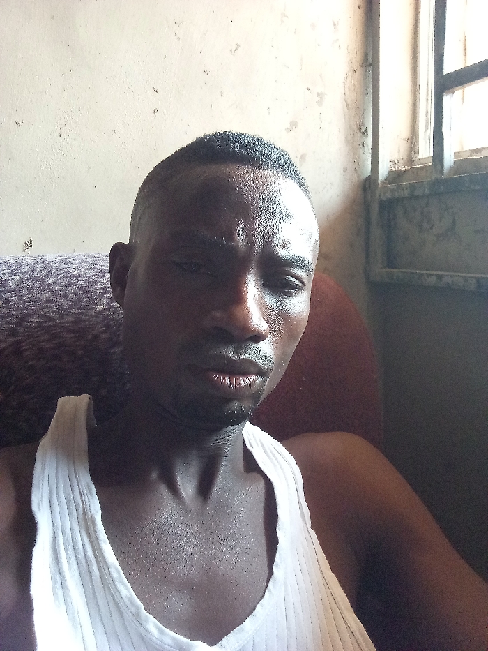 An adult dark-skinned male, estimated to be in his late 20s to early 30s, is seated indoors in Adonkolo, Nigeria