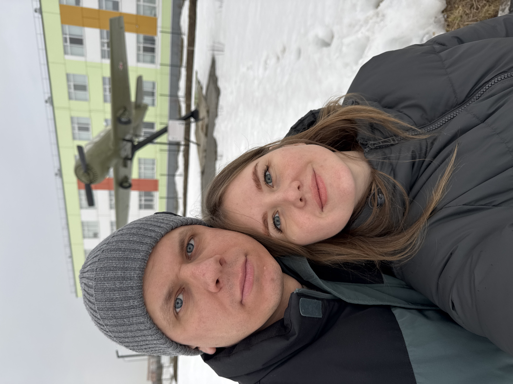 The image depicts a selfie of a man and a woman in an outdoor, snowy environment identified as the city of Горный, Russia. The male, positioned on the left, wears a grey knitted beanie and a two-tone black and dark grey/green winter jacket. He has blue eyes and a neutral expression. The female, positioned on the right and slightly behind the male, has light brown hair and blue eyes, wearing a dark grey puffer jacket and exhibiting a slight smile. Their proximity suggests a selfie. In the background, a light-colored, single-engine propeller aircraft is mounted on a dark stand, serving as a monument. Behind the aircraft, a multi-story building features a facade predominantly colored light green, white, and orange, with numerous windows. The ground is covered in patchy snow, with some visible areas of dried earth or grass. The sky is overcast.