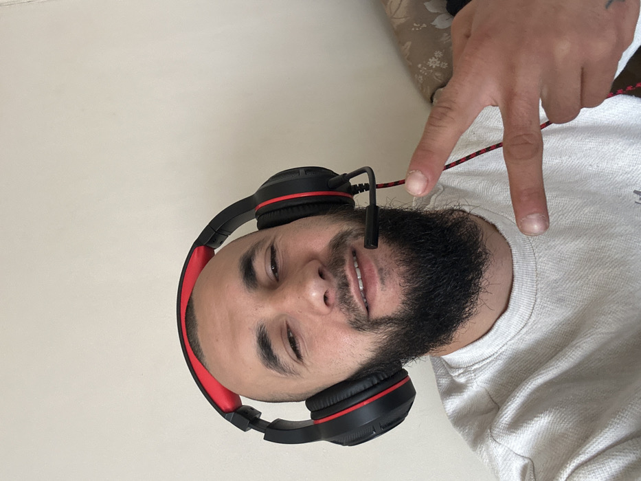 The scene depicts an adult male indoors. He has a shaved head, dark facial hair forming a full beard, and is looking directly towards the viewer with a slight smile, revealing his upper teeth. He is wearing over-ear headphones that are black with red accents on the headband and earcups, equipped with a flexible boom microphone positioned near his mouth. A braided red and black cable extends from the left earcup. The man is wearing a light-colored, possibly off-white or light gray, textured long-sleeved sweatshirt. His right hand is raised, with the index and middle fingers extended in a "V" shape, while the thumb, ring, and pinky fingers are folded. The background consists of a plain, light-colored wall. A portion of a patterned, light-brown fabric object, possibly a cushion or upholstery, is visible on the right side of the frame. The precise location within Varna, Bulgaria, is not discernible from the visual information provided.
