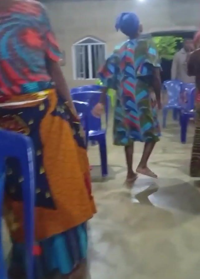 brightly lit indoor scene, likely a church or community hall, where several people are gathered. Three women are prominently visible. One wears a colorful, patterned shirt and a wraparound skirt with an orange panel. Another woman wears a patterned dress in shades of blue, green, and red, while the third has on a dark floral dress. These women appear to be engaging in some form of song or worship. Blue plastic chairs are scattered around the room, and a doorway with a decorative frame is visible in the background. The room has a simple, unfinished look, with bare walls and basic lighting fixtures. The overall impression is of an informal gathering.