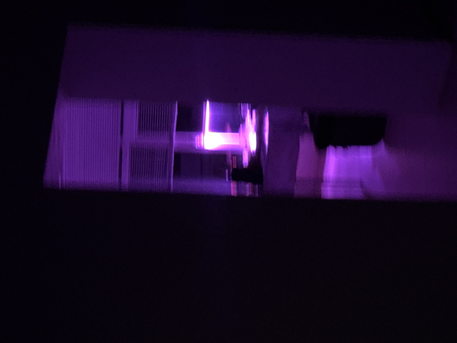 A blurred, dark image reveals a room through an opening. The scene is bathed in purple light, obscuring details. Vertical lines suggest a wall or structure on the left. In the center, a bright, elongated form implies a light source or reflection. Dark shapes vaguely indicate possible furniture or figures, further blurred by the purple hue and focus issues. The lower half of the image is mostly black, emphasizing the illuminated scene above.