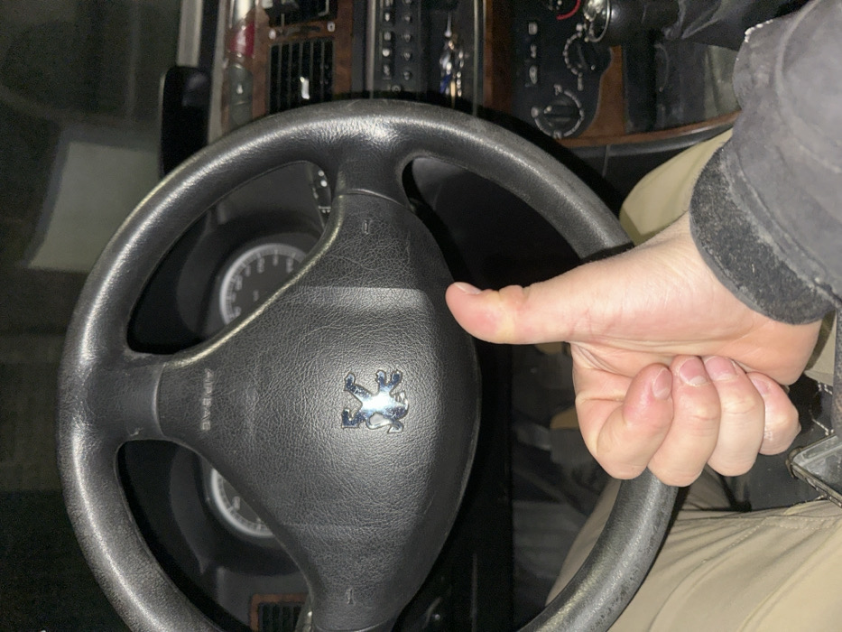 The image displays the interior of a vehicle, viewed from the driver's seat. A human right hand, appearing to be male, is positioned in the lower center, performing a "thumbs up" gesture. The individual is wearing light-colored trousers and a dark sleeve or jacket cuff. The black steering wheel, featuring a chrome Peugeot lion emblem and "AIRBAG" text on its central hub, occupies the upper and central areas of the frame. Behind the steering wheel, portions of the instrument cluster with two visible analog gauges are evident. To the right, part of the dashboard and center console are visible, characterized by wood-grain trim, air vents, and control buttons for what appear to be audio and climate systems. The scene is dimly lit. No external visual information is present within the image to determine a specific location within the city of Montana, Bulgaria.
