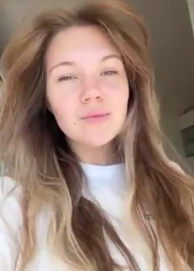 A young woman with fair skin and long blonde/light brown hair is standing outside