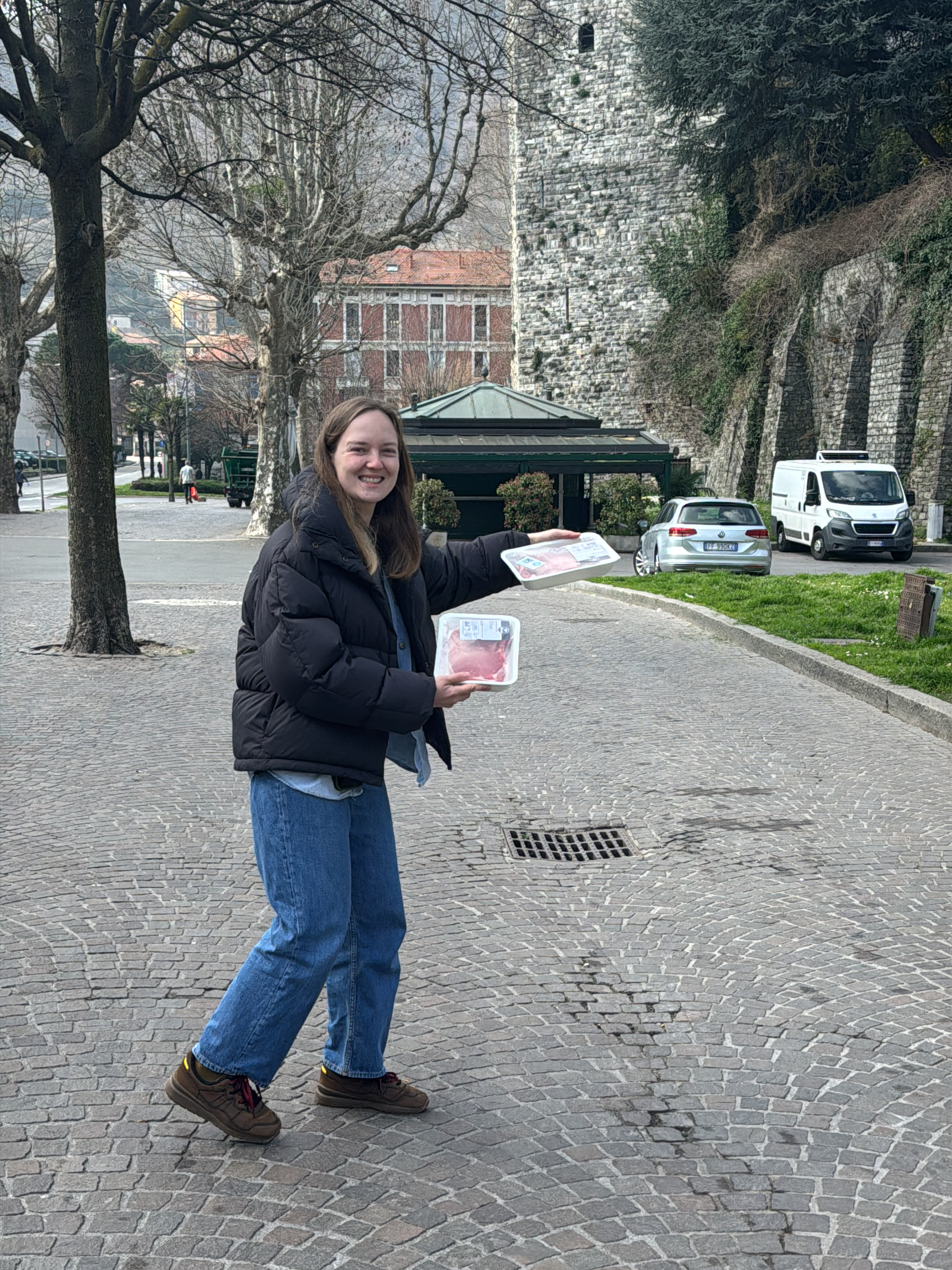 A young adult female stands on a cobblestone street in Como, Italy, smiling towards the viewer. She is dressed in a dark puffer jacket, a light blue shirt, blue jeans, and dark brown lace-up shoes. She holds two clear plastic containers of raw meat, prominently labeled "CARNI," extending them forward with both hands. The background features bare deciduous trees and residential buildings on the left, leading to a distant hillside. On the right, a historic stone wall or tower, partially covered by foliage, stands behind a dark green kiosk with a curved roof. A paved road in the mid-ground contains a silver Volkswagen station wagon and a white commercial van with a visible refrigeration unit. A metal drain grate is visible on the cobblestone ground in the foreground.