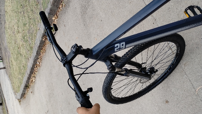 A gray bicycle, partially viewed from above, rests on concrete. The front tire is in focus, with visible spokes and treads. The frame is dark gray, marked with "29." Handlebars are black, complete with levers and cables. A hand grips the left handlebar. A blurred patch of grass is in the background, near the left edge.