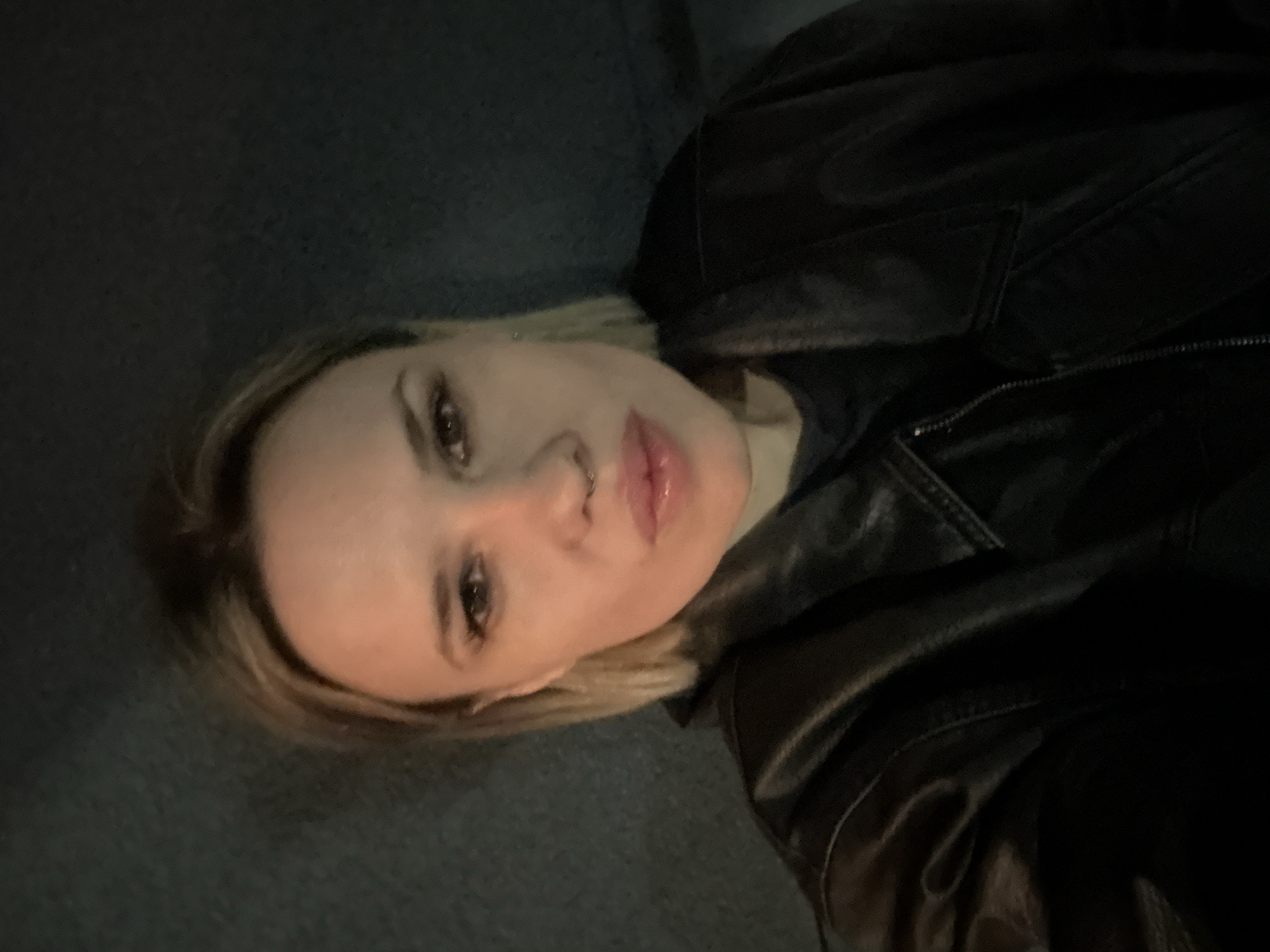 A woman with short blonde hair and a nose piercing is reclining on what appears to be a dark gray couch or upholstered surface. She is wearing a black leather jacket. The location and city are not discernible from the image.