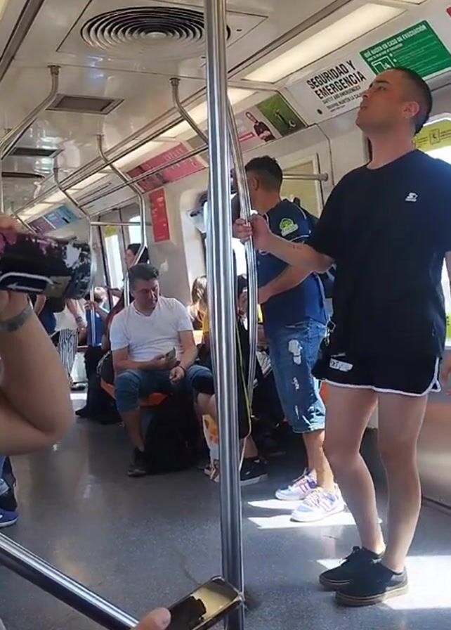 man singing a tune while holding onto a metal pole in a subway car filled with other passengers. The subway car has gray flooring and white walls with advertisements in frames above the windows. Some passengers are seated, and others are standing. The singer is wearing a black t-shirt and short black shorts. One seated passenger is looking at his phone and wearing white earbuds. The video appears to be shot from the perspective of another seated passenger.