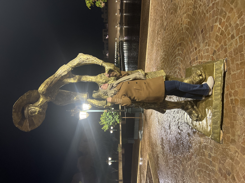 A person wearing a brown coat, jeans, scarf, and white shoes reclines on a golden sculpture at night. The artwork features a large, ring-shaped design at the top and a textured surface that resembles a tree. Street lamps illuminate the area, casting light on the sculpture, the person, and the cobblestone ground. Buildings and water are visible in the background.
