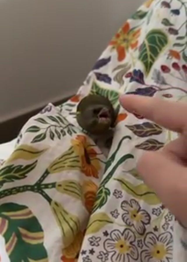 A brief video shows a baby bird on a floral print blanket. A human finger pokes at the bird, provoking it to open its beak widely, seemingly in an attempt to bite. The bird has green feathers and a visible open mouth. The blanket displays a pattern of various flowers and leaves against a white background. The setting appears to be indoors with a neutral-colored wall visible in the background.
