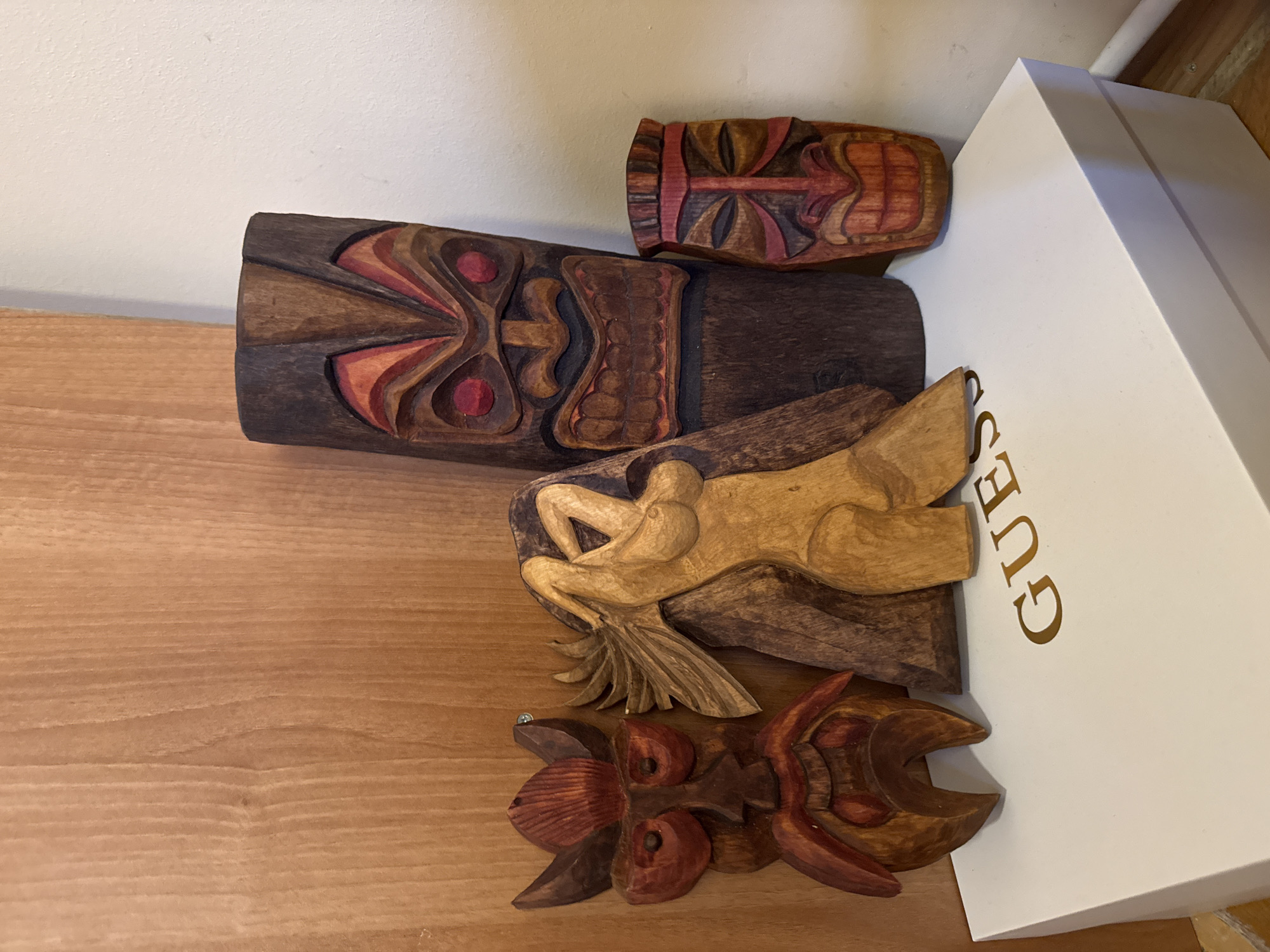 four wooden carvings on a wooden surface next to a white box with "GUESS" printed on it