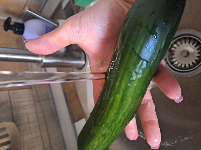 A kitchen sink area, located in the city of Yegoryevsk, Russia, is depicted. A human left hand, with light pink polished fingernails, holds a dark green, ribbed cucumber horizontally. A continuous stream of clear water flows downwards from a chrome or stainless steel kitchen faucet, impacting the top surface of the cucumber. The cucumber and the visible portions of the hand are wet. Below the hand, a metallic sink basin with a circular drain stopper assembly is partially visible. The background features a tiled backsplash with rectangular tiles exhibiting beige and brown tones. To the right of the faucet, a purple bottle with a black pump dispenser, likely liquid soap, is present, alongside a partial view of a green rectangular sponge.