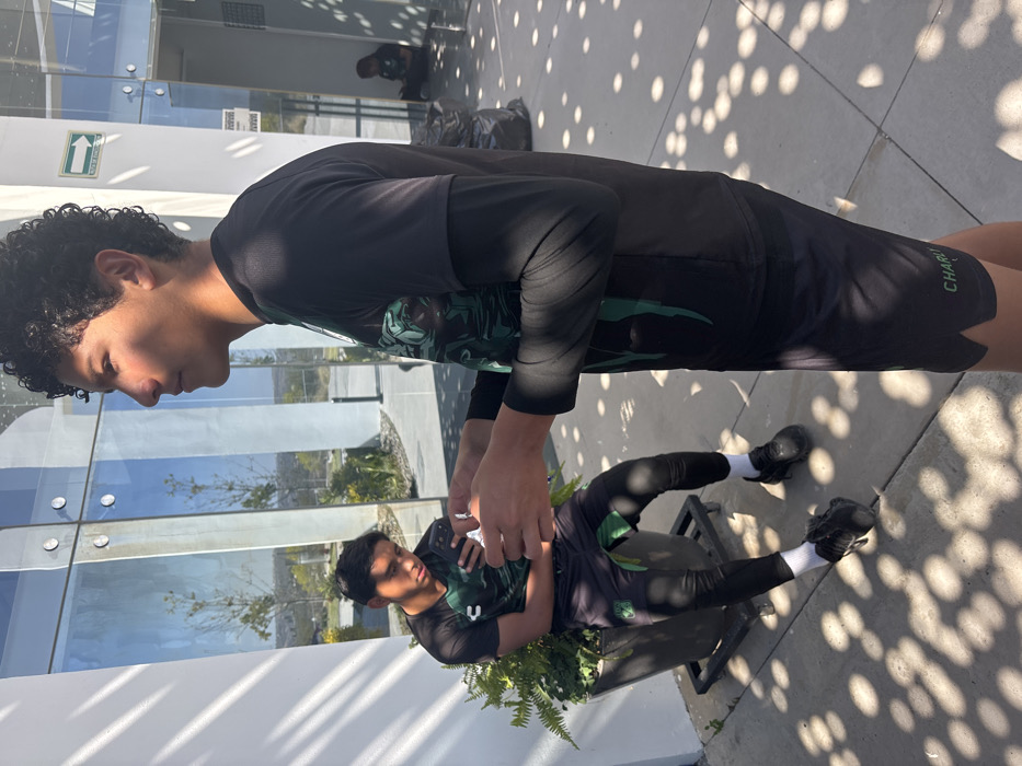 Two people are standing outside a modern building with glass windows. The person in the foreground is standing, while the person in the background is sitting down. Both are wearing similar black and green athletic wear. Sunlight casts dappled shadows on the ground. An exit sign is visible on the building, and a plant sits near the person sitting down. The photo appears to be taken from a slightly tilted angle.