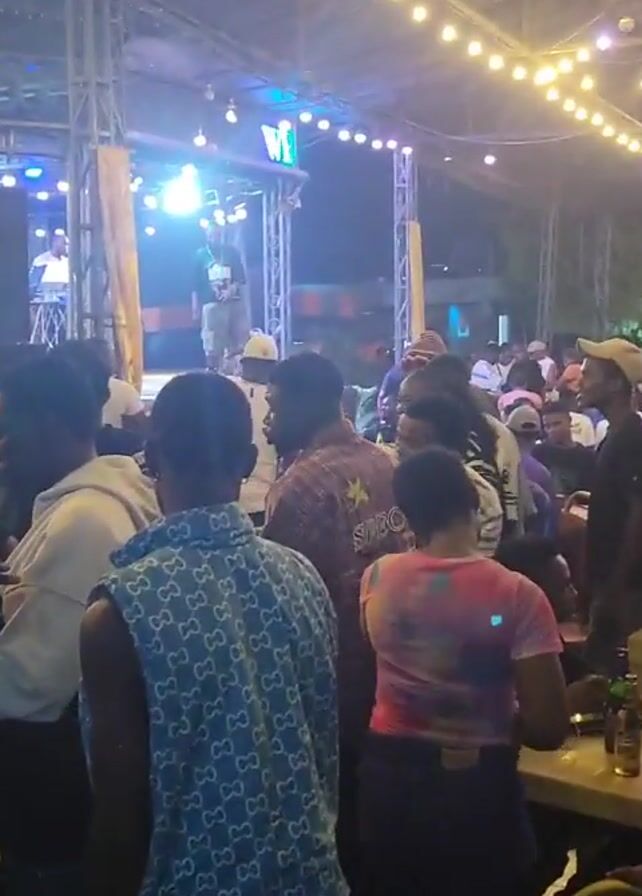 crowded outdoor venue at night. A stage is set up with performers under bright lights. The audience, mostly people of color, stands and dances near tables filled with bottles and drinks. Strings of warm-toned lights hang above the crowd, adding to the festive atmosphere. Some audience members are interacting with each other while others are focused on the performance.