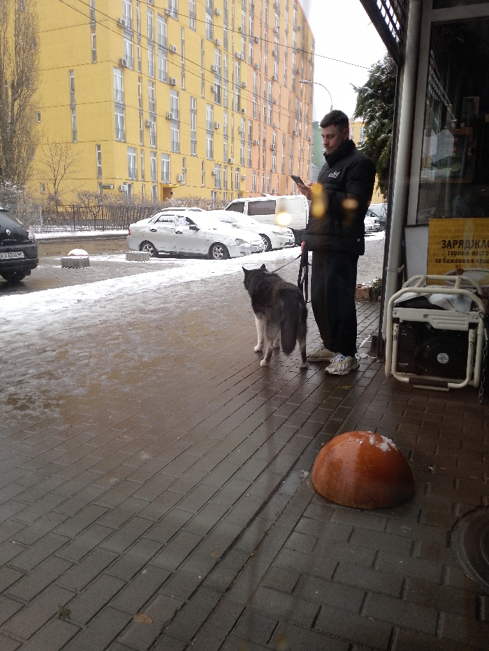 The image captures an urban street scene in Kyiv, Ukraine, during daylight under overcast conditions with visible snow and ice. A male individual, appearing to be 25-35 years old, with short dark hair, wears a black puffer jacket, dark trousers, and white athletic shoes. He stands on a wet, dark-tiled sidewalk, engrossed in a smartphone held with both hands. To his left, a medium-to-large husky-type dog with grey and white fur stands on a black leash, which the man holds. The dog's back is partially turned towards the viewer, facing the street. To the man's immediate right, a portable generator is visible, positioned near a commercial building frontage which features a sign with Ukrainian text. In the immediate foreground, a rusty orange, hemispherical concrete bollard, partially covered in snow, rests on the sidewalk. Beyond the sidewalk, the street is covered in patches of melting snow and ice. Several vehicles are parked along the curb, including a dark Renault hatchback with a Ukrainian license plate (AX 6300 HC), followed by two white sedans largely covered in snow, and a white cargo van further down the street. In the background, a large, multi-story residential building with a distinctive bright yellow facade, featuring numerous windows and external air conditioning units, dominates the scene. An adjacent section of the building to the right transitions to an orange hue. Bare trees and dark metal fencing are visible along the street, separating it from the residential buildings.