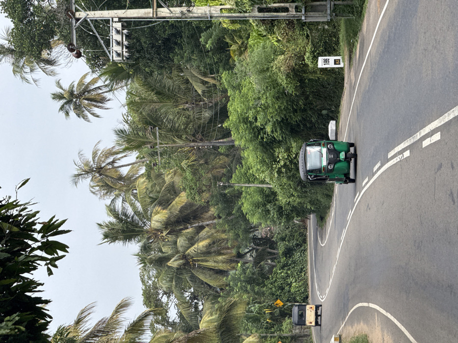 A curved road winds through lush tropical vegetation with palm trees lining the way. A green tuk-tuk navigates the bend. Overhead, power lines run parallel to the road. Road markings delineate the lanes, and a signpost stands beside the road. In the distance, another vehicle approaches the bend.