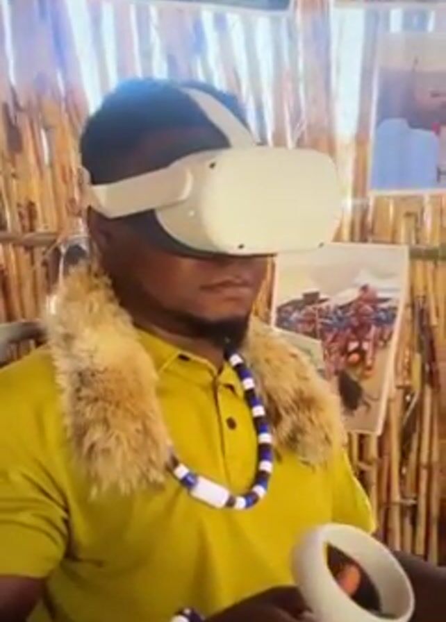 A man wearing a yellow shirt with a fur collar and a blue and white necklace and bracelet is seen using a white VR headset. He is holding a controller in his right hand and sitting on a chair inside a structure with bamboo walls. There are several framed pictures hanging on the walls around him. He appears to be focused on the VR experience. Music is playing in the background.