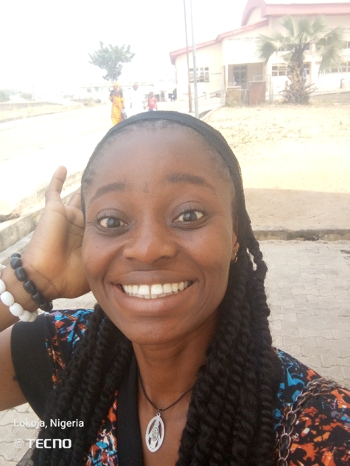The image displays a close-up, eye-level view of an adult female in an outdoor setting in Lokoja, Nigeria