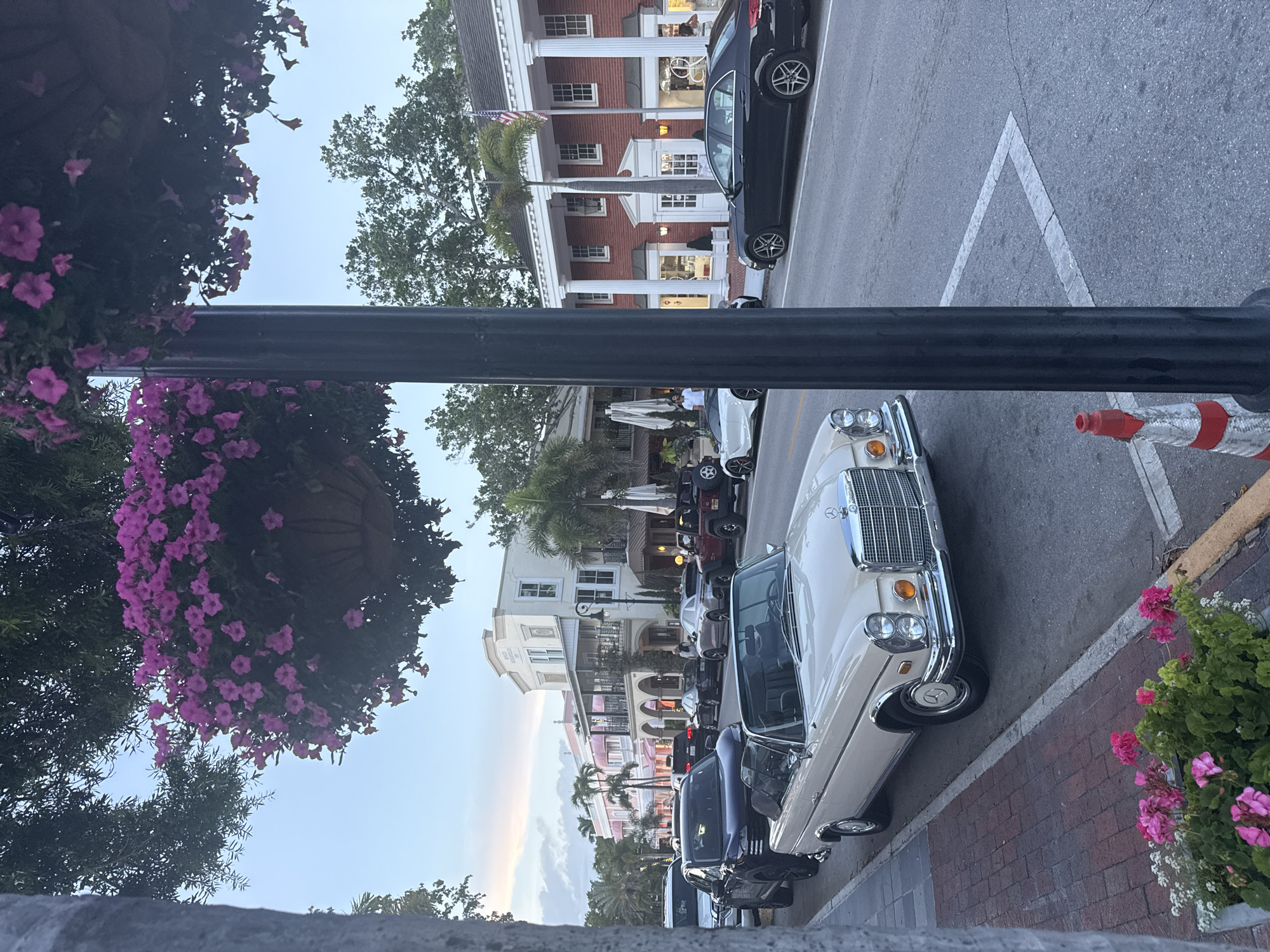 The image depicts a street scene in Naples, Florida, United States of America. The perspective is from street level, possibly behind a low wall or barrier. A black lamp post with hanging baskets of pink petunias is in the foreground. The street is lined with parked cars, including a vintage white Mercedes-Benz convertible and several modern luxury vehicles. Buildings with architectural styles ranging from colonial to Mediterranean Revival flank the street. People are visible in the background, some possibly entering or exiting shops. The road surface shows pavement markings. A red and white traffic cone is on the right. The sky is overcast with a hint of sunset hues on the horizon. The overall scene suggests a commercial district, possibly a high-end shopping area.