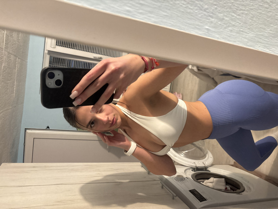 An indoor scene, stated to be in the city of Balinovtsi, Bulgaria, depicts a young adult female taking a mirror selfie. The female subject has light skin and dark hair, wearing a white halter-neck sports bra and periwinkle blue or light purple seamless leggings. She holds a dark-cased smartphone in her right hand, positioned to capture her reflection in a large rectangular mirror with a white frame. Her left hand is raised towards her left temple. A white smartwatch is visible on her left wrist, and multiple red and pink string bracelets are on her right wrist. In the reflection behind the subject, a silver-colored front-loading washing machine with its door ajar and containing white laundry is visible to the left. Above the washing machine, a light-colored wooden cabinet is present. In the background of the reflection, a white door frame and a window with white Venetian blinds are observable. The room features light-colored walls and a textured white ceiling.