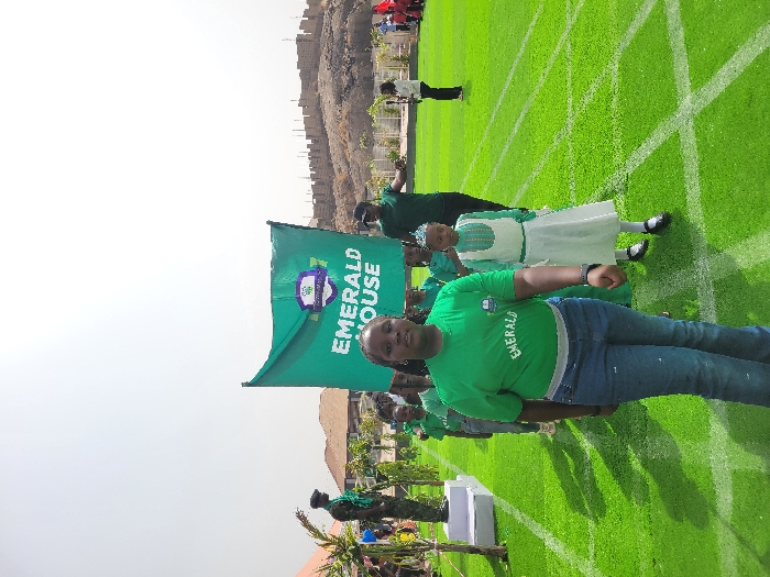 An outdoor procession unfolds on an artificial green turf field marked with white lines, under a clear, bright sky. A young female, wearing a green "EMERALD HOUSE" t-shirt, blue jeans, and a black wristband, walks forward in the foreground, slightly to the left of center. To her right and slightly behind, a younger girl in a white dress, green long-sleeved top, and a silver tiara also walks forward. Behind these two, a line of individuals, predominantly children in green shirts, progresses, led by a large green banner with "EMERALD HOUSE" written in white capital letters and a circular school logo at the top. An adult male, dressed in a green t-shirt, holds the right pole of this banner. In the far left background, a person in camouflage uniform stands next to a green statue of a soldier on a white pedestal. The far right background is dominated by a rocky hill featuring light-colored stone or mud-brick structures resembling fortifications or ancient ruins. This distinctive rocky landscape is characteristic of the Jos plateau, indicating the location is within or near the city of Jos, Nigeria, possibly with the Shere Hills in the distant background.