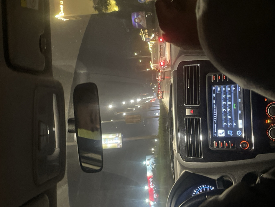 Inside a car at night, the dashboard and steering wheel are visible. The infotainment system displays a phone dial pad. Through the windshield, streetlights and other car lights illuminate a congested road. The rearview mirror reflects the driver's face. Advertisements appear on billboards along the roadside. The image is slightly blurry and the camera is tilted.