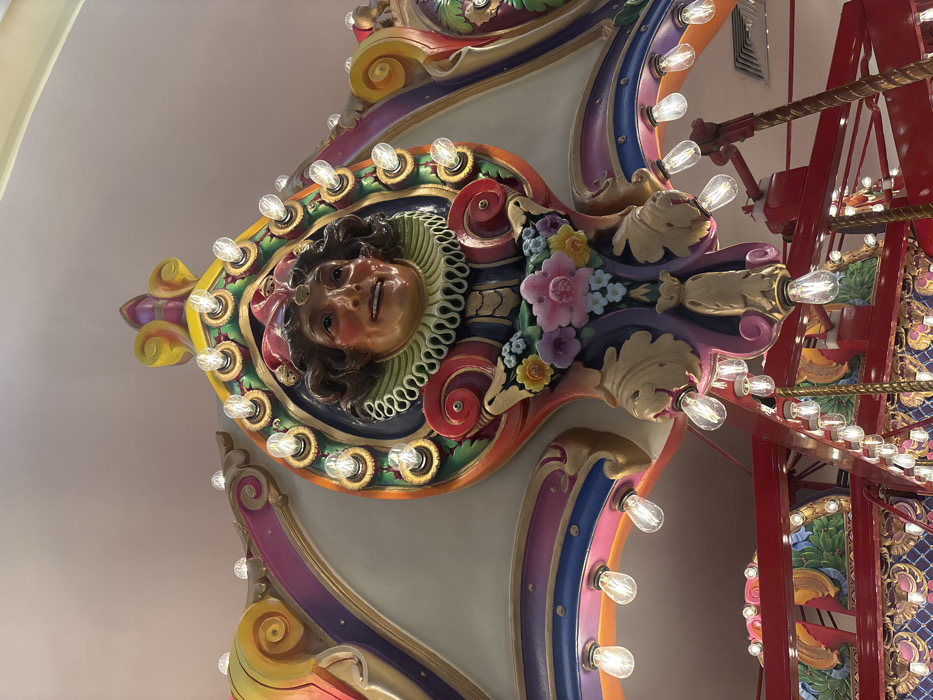 A whimsical carousel detail features a painted man’s face with a white ruffled collar, adorned with a pink bow in his hair