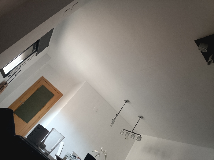 The scene is an interior room located in Sagunto, Spain. The room features predominantly white walls and a varied ceiling structure, including a darker flat section in the upper left transitioning to a sloped, light-colored ceiling across the majority of the view. A black-framed window with an external shutter partially open is visible in the upper left wall, adjacent to a hanging patterned fabric. Below the window, a light-toned wooden door with a dark rectangular glass insert is present. Two chandeliers are suspended from the sloped ceiling in the mid-right, one with multiple bulb arms and another with four square-shaped luminaires. An additional black ceiling fixture with three spotlights is mounted in the upper right. In the lower foreground, a dark surface, possibly a desk, holds a silver laptop, a tall clear glass vase, and other indistinct items. A small white floral arrangement is partially visible on the right edge of this surface. No individuals or dynamic actions are depicted.