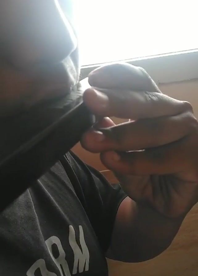 A person wearing a dark gray t-shirt with white text is playing a harmonica. The instrument is held to the person's mouth with their left hand while their right hand provides support. A bright light source is visible behind the person, appearing to be a window. The background has a wooden panel appearance.