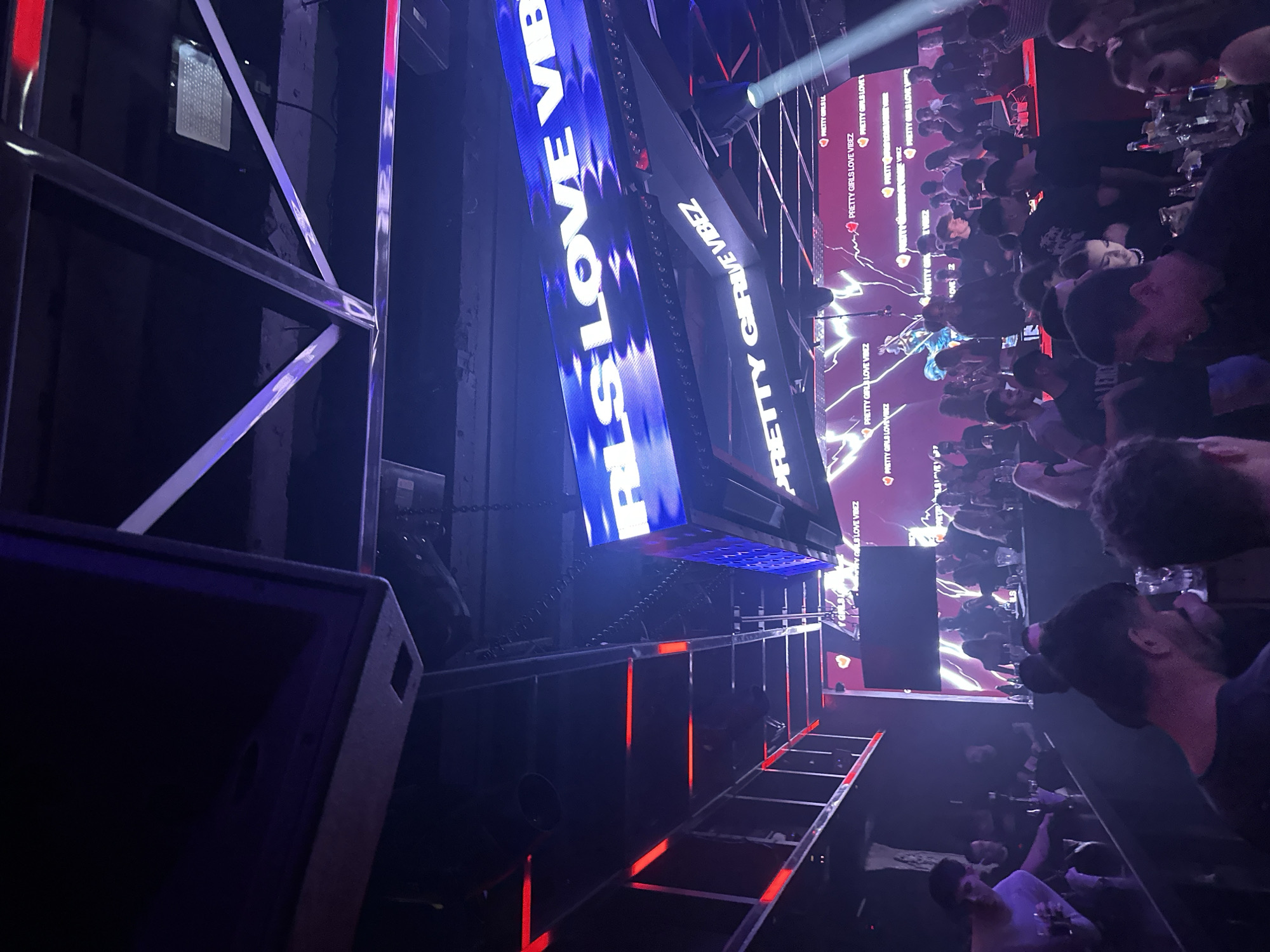 The image depicts the interior of a crowded nightclub in Sofia, Bulgaria, characterized by low light and vibrant club lighting. Overhead, the ceiling structure reveals exposed metal trusses and various fixtures, including speakers and linear red LED strip lights. A large, multi-sided LED display hangs centrally, illuminated with prominent white text reading "GIRLS LOVE VIBEZ" and "PRETTY GIRLS LOVE VIBEZ" against a blue background. The club floor is densely populated with an estimated 50-70 individuals, primarily young adults, who are standing, socializing, and consuming beverages from glasses and bottles. In the midground and background, a large LED wall spans the width of the venue, displaying a dynamic graphic of red lightning-like patterns and repeating "PRETTY GIRLS LOVE VIBEZ" text alongside small heart icons. A stage or DJ booth area is visible in the background against this screen. In the foreground, several individuals are partially visible. On the left, a male in a light-colored t-shirt holds a clear glass. Other patrons are observed from the back or side, some interacting with mobile phones. Tables and counters present within the scene hold multiple bottles and glasses, indicative of beverage service. The overall environment conveys an active, social nightlife setting.