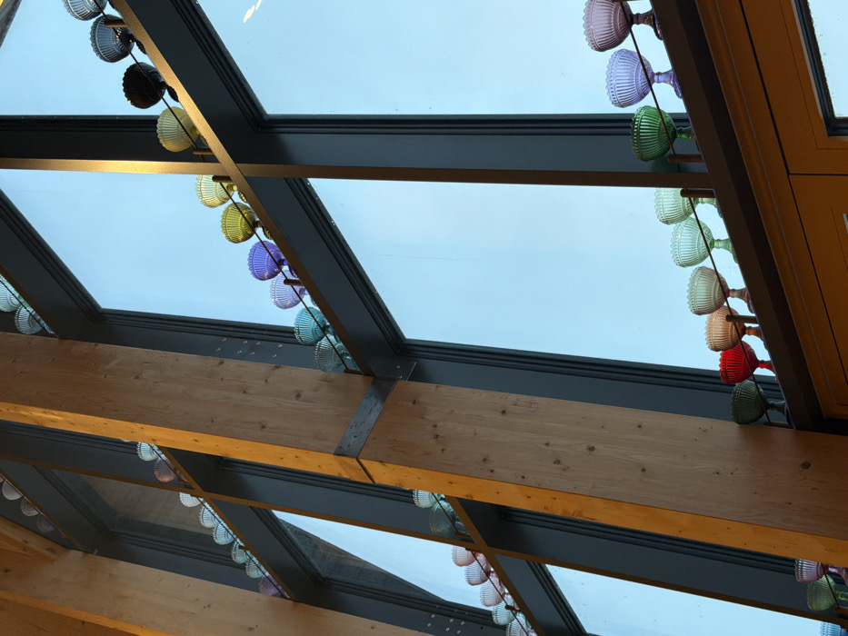The image presents an interior architectural view within a building in Flakstad, Norway, focusing on a large multi-pane window system. Prominent light-colored laminated timber beams, likely glulam, form structural elements, intersecting at various angles within the frame. Dark-colored metal window frames delineate numerous rectangular glass panes, through which a clear, bright blue sky is visible, indicating daylight conditions. Along the horizontal window mullions, rows of small, translucent glass objects are displayed. These objects, resembling ribbed goblets or shallow bowls, are arranged in continuous linear sequences and exhibit a wide spectrum of colors, including various shades of green, blue, purple, yellow, orange, red, and pink. They appear to be mounted on slender metal rods or wires. Natural light illuminates the scene, highlighting the distinct colors of the glass decorations and casting warm tones on the wooden beams. No individuals or active subjects are present within the frame.