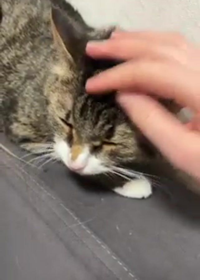 A person is petting a tabby cat. The cat is lying down on what appears to be a gray surface. The person's hand is petting the cat on its head and around its ears. The cat has its eyes closed, seemingly enjoying the attention. The background is a plain, light-colored wall. The scene appears to be indoors.