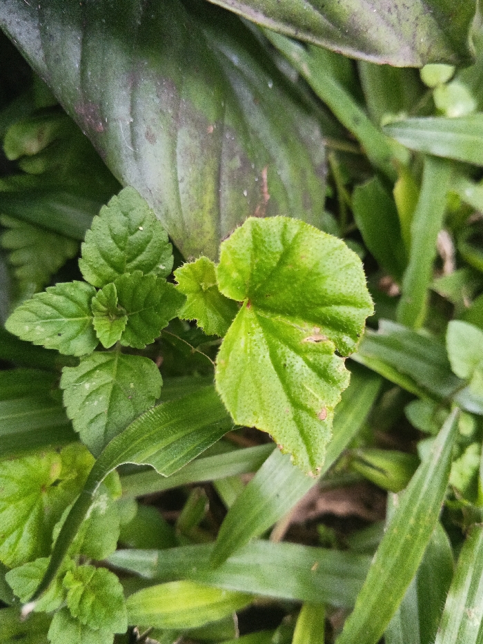 The scene depicts a close-up view of ground-level vegetation in Ciherang, Indonesia. The primary subjects are two distinct types of green plants centrally positioned among other foliage. On the left, a cluster of small, vibrant green leaves with finely serrated edges and a slightly textured surface forms a compact plant structure. Adjacent to it, on the right, is a larger, roughly heart-shaped leaf with a prominent textured, bubbly surface and serrated margins. This larger leaf exhibits minor brown discoloration or damage along its upper-right edge. Surrounding these central plants are various other green leaves and elongated blades of grass, some sharply focused and others softly blurred in the foreground and background, indicating a shallow depth of field. A larger, darker green leaf with a smoother texture is visible in the upper background, partially out of focus. No human presence, actions, or interactions are discernible. The lighting appears natural and even, illuminating the diverse shades of green foliage.