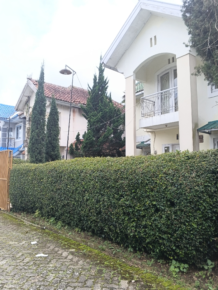 The scene depicts a residential area in the city of Pô Kô, Vietnam, under an overcast sky. In the foreground, a paved surface, likely constructed from interlocking blocks, shows patches of moss growth and scattered white debris. A dense, trimmed green hedge runs horizontally along the right side of the pavement, acting as a property boundary. To the far left, a section of a vertical wooden or bamboo slatted gate is visible. Behind the hedge, multiple multi-story residential buildings are present. The most prominent structure on the right is a two-story house with light-colored (likely cream or beige) walls, a white-trimmed gabled roof, and a second-story balcony featuring an arched recess, a white ornate metal railing, and glass doors. A smaller green-tiled awning is visible on the ground level. To the left of this house, a second building with an off-white, somewhat weathered facade and a red-tiled roof is visible, along with a visible gutter system. A third house, partially visible on the far left, features a distinct blue-tiled roof. Several tall, slender coniferous trees with dark green foliage are positioned between and in front of the buildings, rising above the hedge line. A street lamp with a wide, dark, disc-shaped shade is mounted on a pole, centrally located above the hedge and in front of the middle-ground house. Thin utility lines are observable against the sky and buildings. The scene is devoid of human presence or activity.